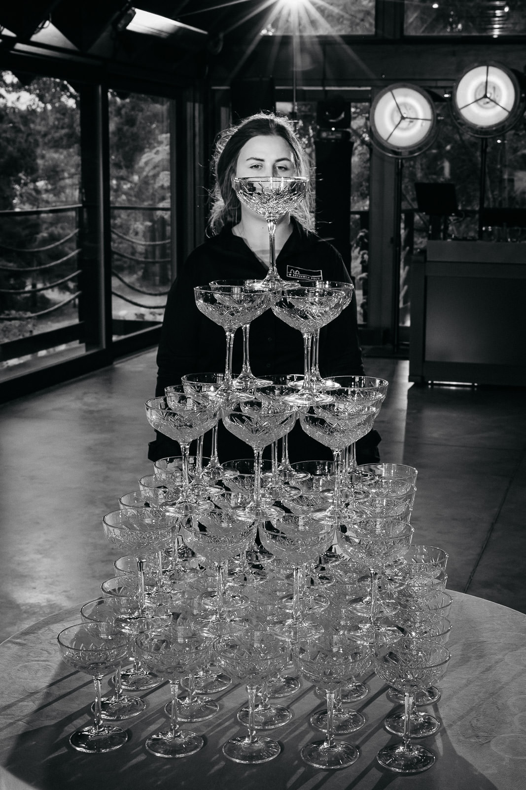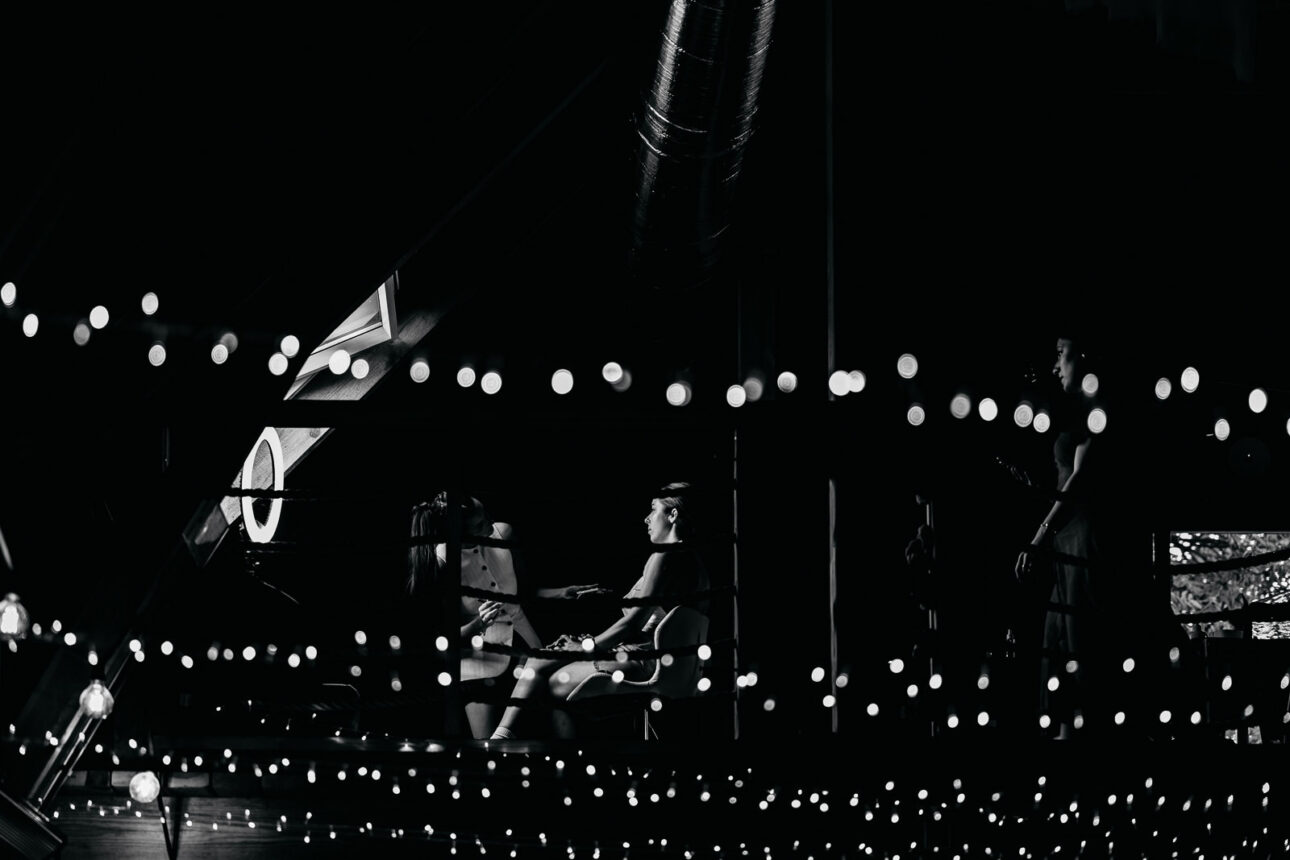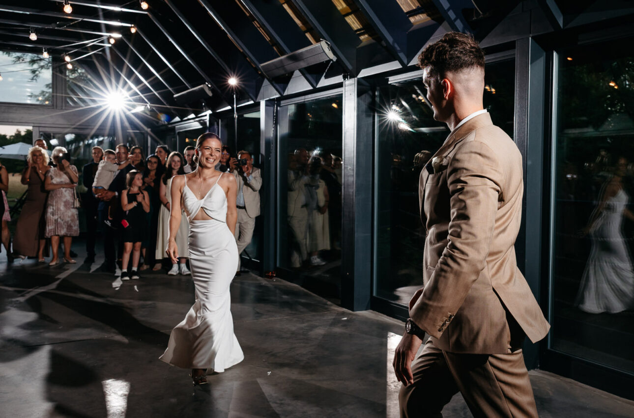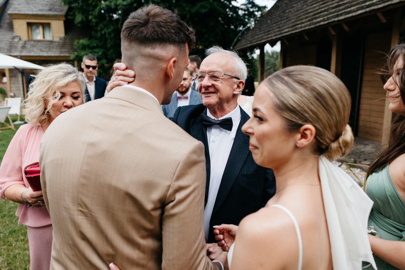 Po ceremonii tempo tylko wzrosło. Wejścia do sali do różnych utworów, wieża z szampana, zdjęcia grupowe i pierwszy taniec, po którym razem z Michałem Rybakiem — filmowcem (podkreślam: filmowcem, nie kamerzystą, broń Boże) — wyskoczyliśmy na błyskawiczny plener. Na całym terenie wesele w Szczerym Polu żyło własnym rytmem: rozmowy przy drinkach, wylegiwanie się pod lampkami, a także szybkie powroty na parkiet, bo DJ PLK dokładnie wiedział, kiedy dorzucić do pieca i podkręcić atmosferę. Były momenty totalnie wzruszające, jak taniec Klaudii z tatą, i takie, które zostaną w legendach rodzinnych, jak Maciek śpiewający z ekipą kolegów.