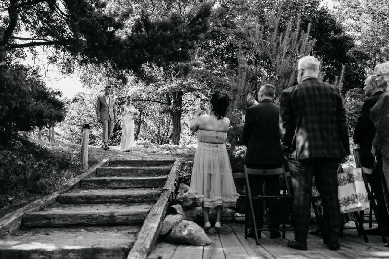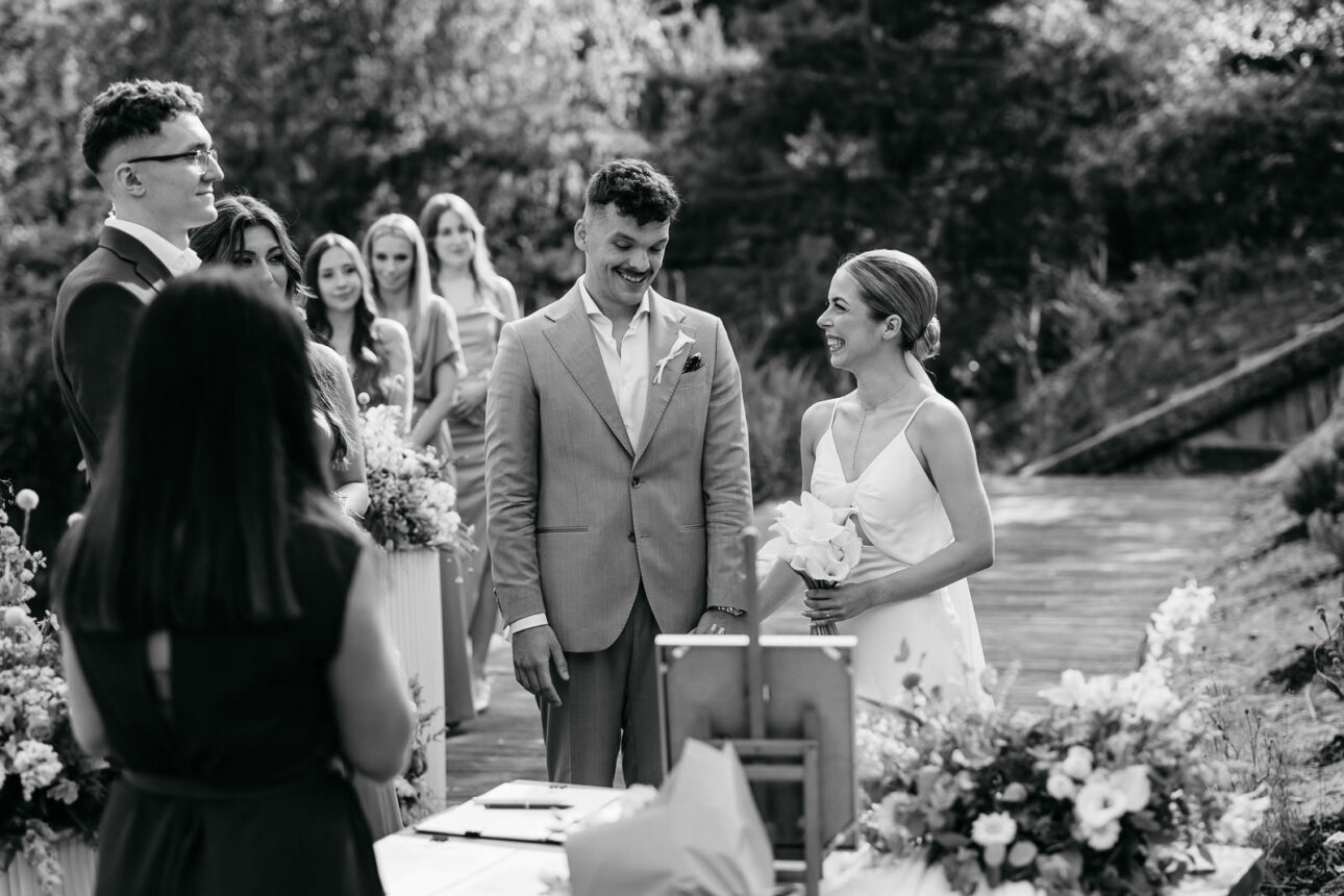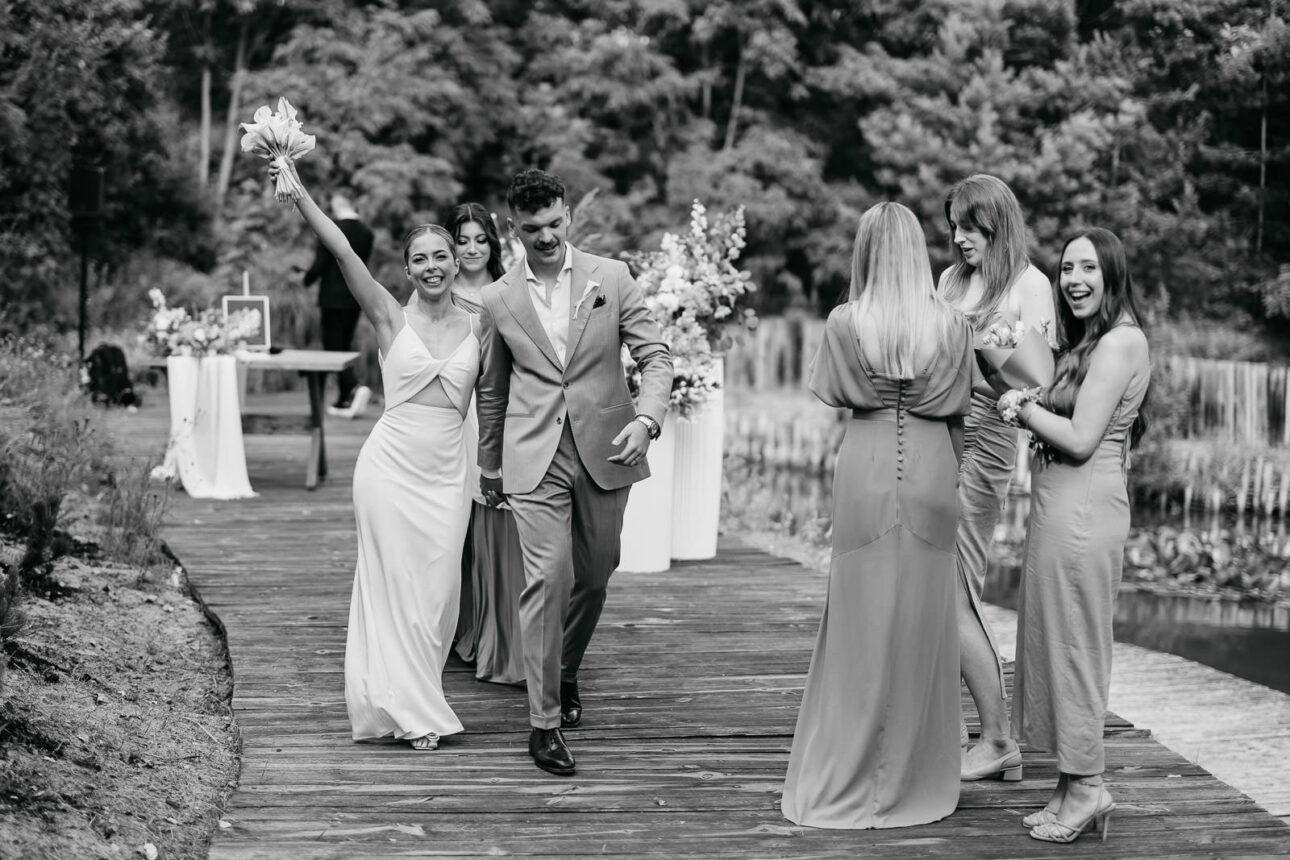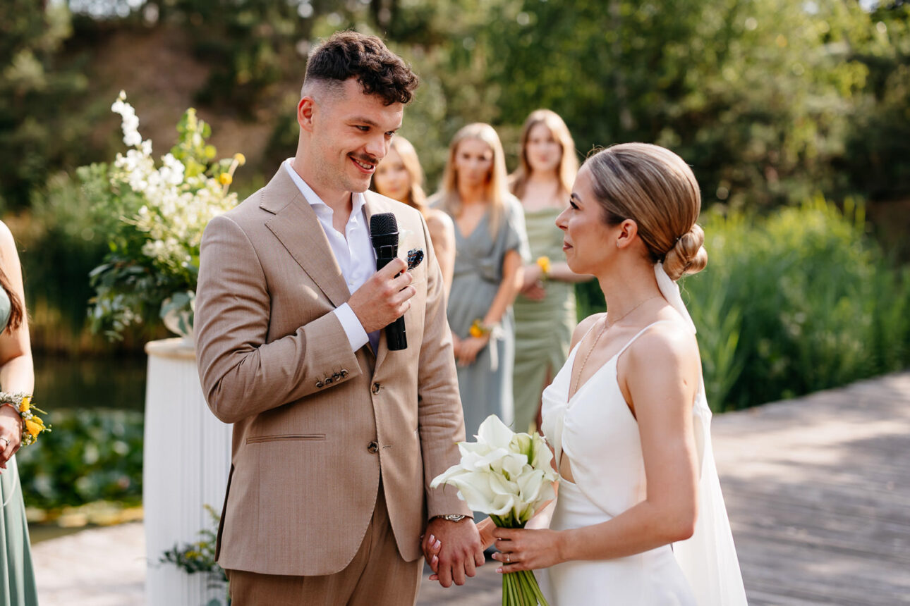 Jeszcze przed ceremonią nastąpił first look Maćka i Klaudii. I tu oficjalnie ogłaszam: pierwszy pakiet łez został uruchomiony. Potem Pannę Młodą zobaczyły druhny — pakiet łez numer dwa. A gdy przenieśliśmy się nad staw, gdzie odbywała się ceremonia, goście zasiedli niemal jak na trybunach, gotowi na spektakl miłości w najlepszym możliwym wydaniu. Widziałem już wiele przysiąg i każda jest inna, ale tu było tak autentycznie, radośnie i szczerze, że w pewnym momencie jednocześnie się śmiałem i wzruszałem. Oczywiście jak na profesjonalnego ninja przystało — zza aparatu, udając pełną kontrolę nad sytuacją (spoiler: nie była pełna).